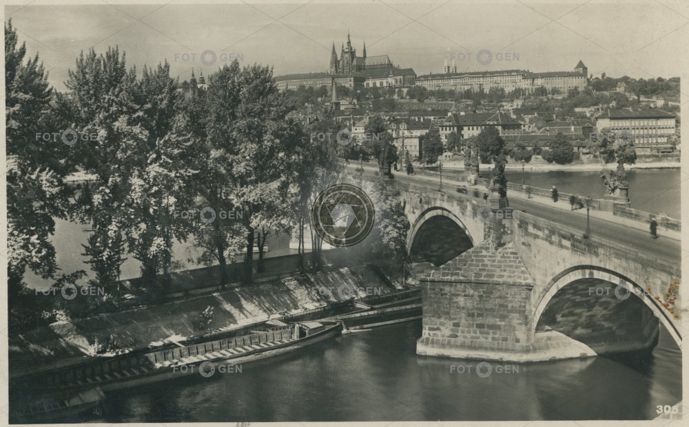 1941 boat Hradčany Charles Bridge Karlův most Lesser Town loď Malá Strana místopis Prague Prague Castle Praha Pražský hrad river řeka topography Vltava