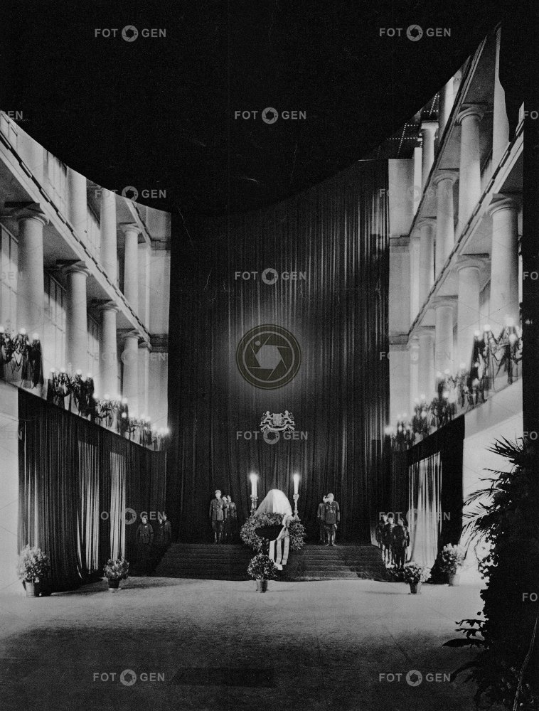 1937 celebrity Československa Československý event hrad katafalk osobnosti Osvoboditel Plečnikova pohřeb Pražský prezident první rakev síň sloupcová smrt smuteční T.G. Masaryk tatíček Tomáš Garrigue Masaryk událost úmrtí věnec