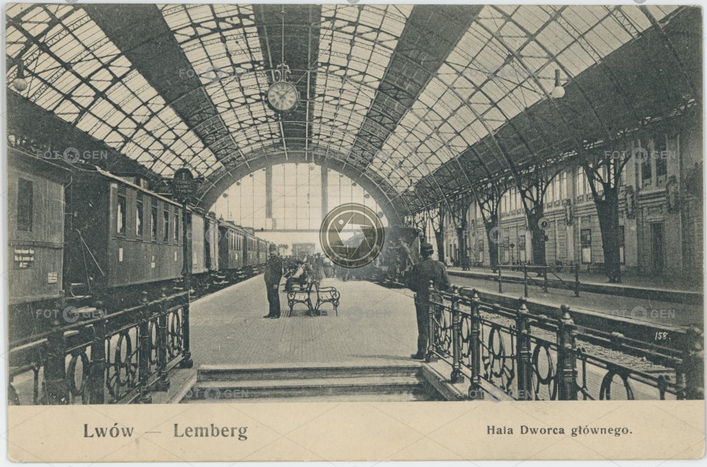 alive cestující clock doprava dráha dráhy hala hall hlavní hodiny interiér klenba klenbová Lamberg lidé Lvov místopis nádraží nádražní nástupiště neprošlo osobní osobní vlak passenger train peron platform roof topography train transport trať vaulted hall vlak zaměstnanci zařízení železniční živá