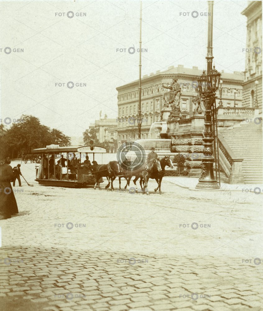 city transport čtyřspřeží doprava fontána fountain four-lane horse horse tram kašna koňka kůň městská doprava místopis Národní muzeum National Museum pouliční lampa Prague Praha street lamp topography transport