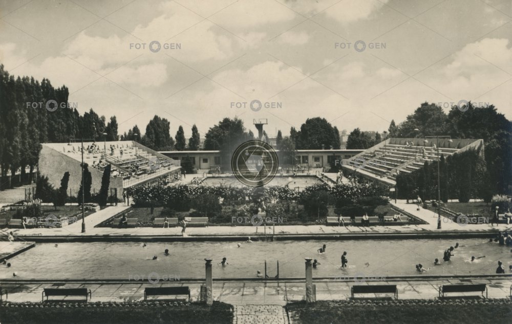 1959 bath bazén bazény Blava Bratislava koupající koupaliště leisure lidé místopis plavci pláž plovárna pole pool Pozsony skokánek Slovenská Slovensko swimming Szlovákia Tehelné topography volný čas