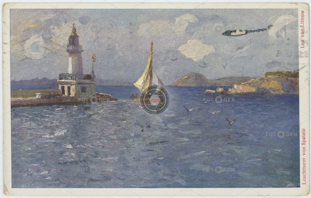 1913 Adriatic Sea art barevná beacon boats color colored Croatia doprava drawing Chorvatsko Jaderské moře kolorovaná kresba lighthouse loď loďky maják malba místopis painting parník plachetnice sailing boat sea-mark ship Spalato Split steamboat topography transport umění