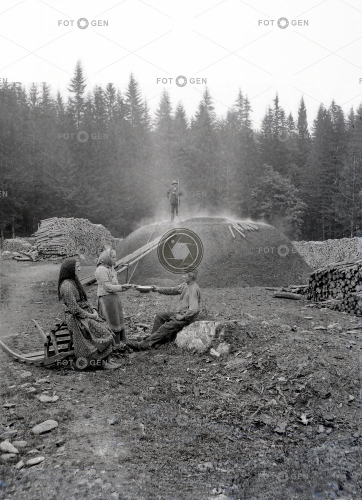 burning dřevěné uhlí dřevo ethnology etnologie Fire food forest fotoscéna Giant Mountains charcoal jídlo kouř Krkonoše les lunch milestone milíř oběd oheň pálení photo scene práce pracovní oděv Riesengebirge Silesia Slezsko smoke wood work work clothes