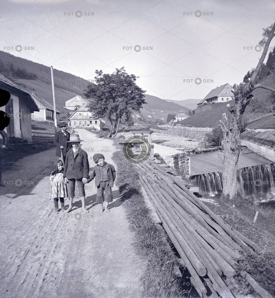 děti dřevo Giant Mountains children Krkonoše leisure místopis posing pózování rafting Riesengebirge river road řeka silnice splav topography údolí valley Velká Úpa volný čas wood