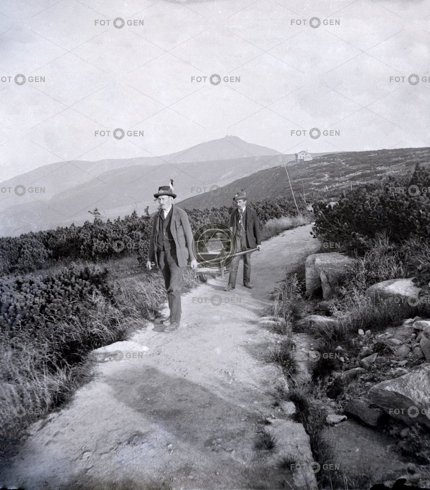 cesta Giant Mountains horský hřeben kleč kneel krajina Krkonoše Landscape mountain ridge nosiči nosítka porters práce Riesengebirge road stretchers tourism turismus work