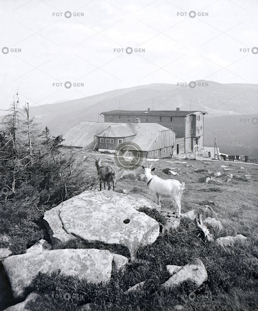 Giant Mountains goat grazing hut kameny koza krajina Krkonoše Landscape louka meadow místopis pastva Peter's hut Peterbaude Petrova bouda Riesengebirge shepherd slope stones svah topography
