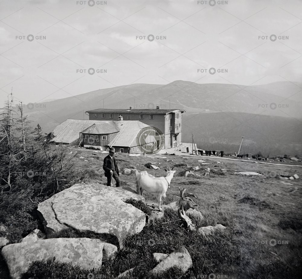 boulder Giant Mountains goat grazing horal hut kameny koza krajina Krkonoše Landscape louka meadow místopis mountaineer pastva Peter's hut Peterbaude Petrova bouda práce Riesengebirge scenery / landscape shepherd slope Sněžka stones svah topography work