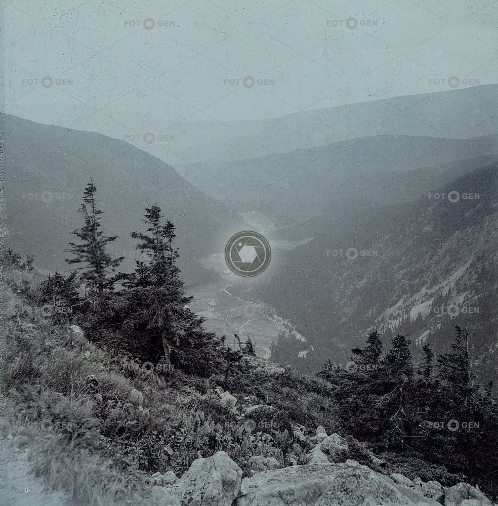 bird's eye view fog kameny krajina Krkonoše Landscape mlha ptačí perspektiva Riesengebirge slope stones stromy svah trees údolí valley