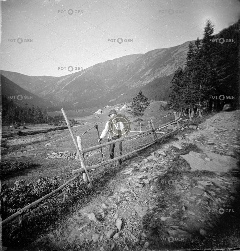 cesta fence forest Giant mine Giant Mountains kosa Krkonoše les místopis Obří důl oděv ohrada peasant práce pracovní Riesengebirge road rolník scythe topography údolí valley work work clothes