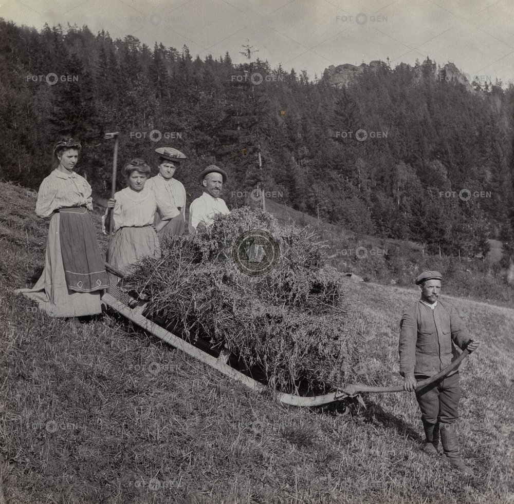 Giant Mountains grass hay hay baling Krkonoše práce pracovní oděv saně seno sleigh slope svah svážení sena tráva Vysoké nad Jizerou work work clothes