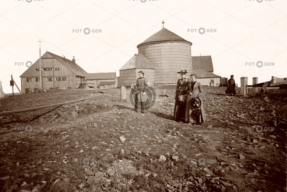 bouda cestovní oděv Czech hut Česká bouda dáma Giant Mountains hat hiking hut chapel kaple sv. Vavřince klobouk Krkonoše lady leisure místopis Pruská bouda Prussian hut Schneekoppe Sněžka topography travel clothes trip turistika volný čas výlet woman žena