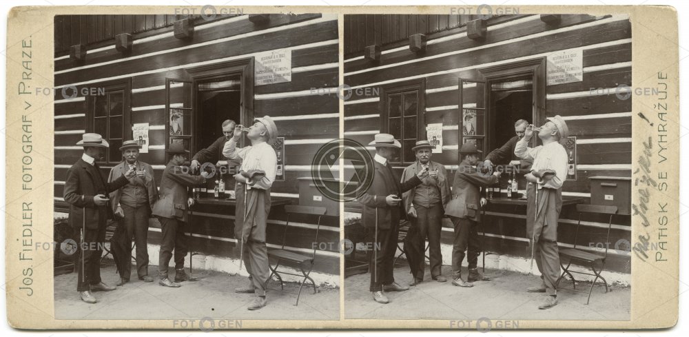 Labský důl, bouda U dívčí lávky, Občerstvení před cestou na Sněžku. Zobrazeni:  písničkář Karel Hašler, herci Rudolf Kafka, Florentin Steinsberg a jeden neznámý,  stereofotografie