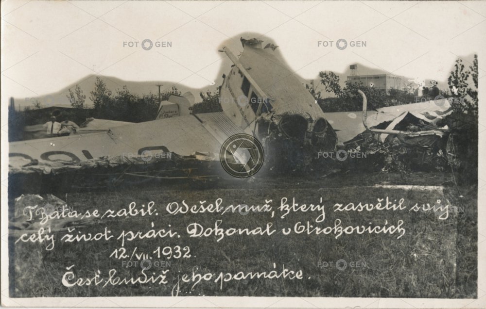 1932 accident air disaster airplane Baťa Baťov Brouček event Jindřich Brouček Junkers letadlo letecká katastrofa místopis nehoda neštěstí Otrokovice Otrokowitz pilot plane crash Tomáš Baťa topography tragédie událost zřícení letadla