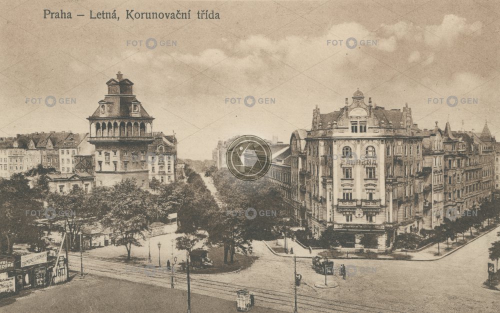 32 bank banka Holešovice Korunovační Letenská water tower Letná místopis Občanská záložna peněžní ústav Prague Praha Praha 7 topography union vodárenská věž water tower záložna