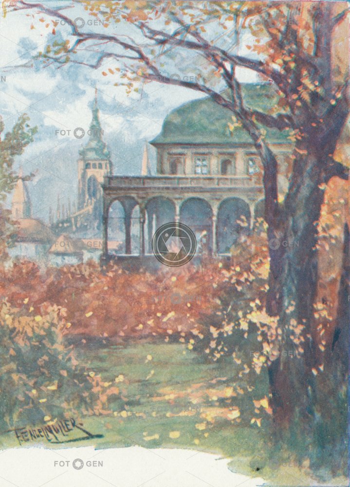 akvarel art barevná Belveder castle Steps colored elvedere Ferdinand Engelmüller gardens Hradčany král kresba Lesser Town letohrádek královny Anny Malá Strana malba místopis obraz Picture Prag Prague Prague Castle Praha Pražský hrad Renaissance renesance topography umění Watercolor painting zahrada Zámecké schody
