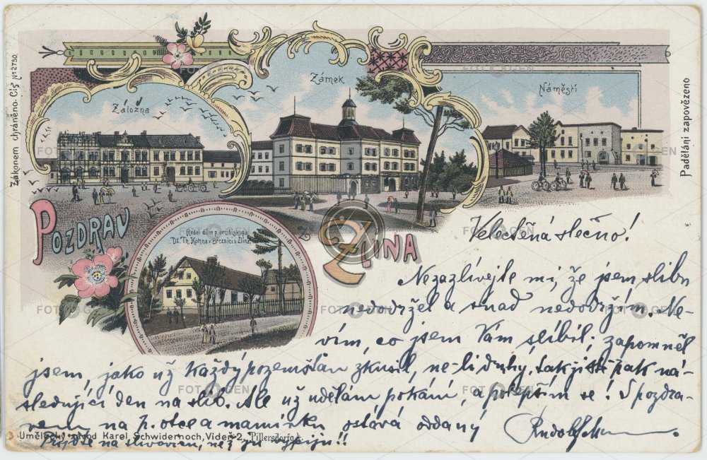 barevná castle color colored Gottwaldov hotel kolorovaná lithography litografie Míru místopis náměstí okénková skládaná square topography záložna Zlín