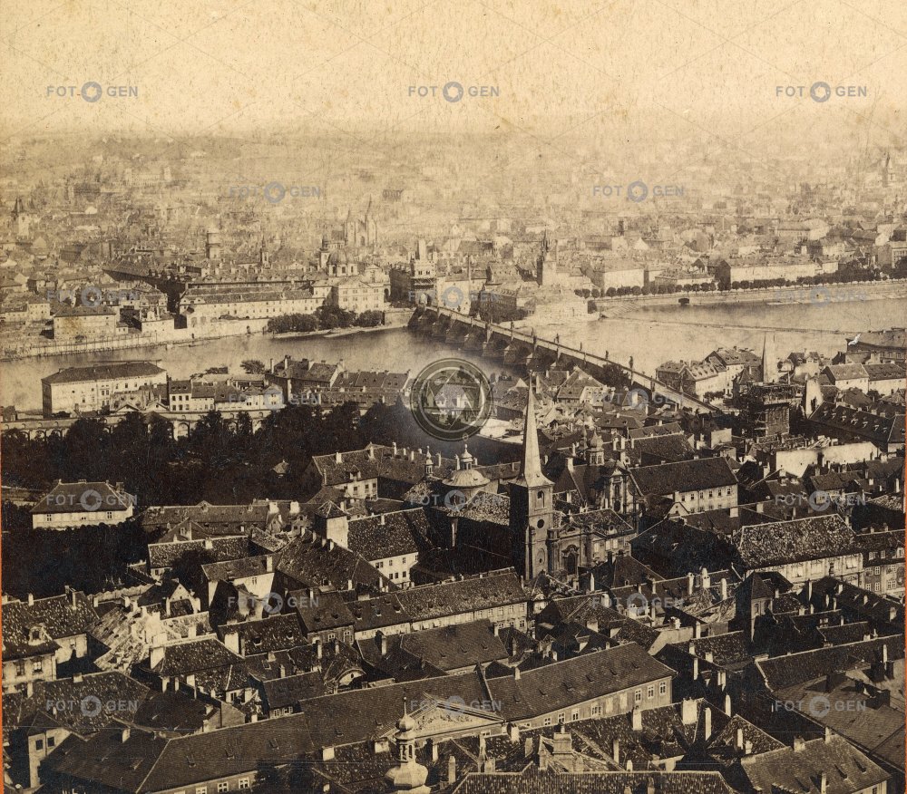 bird's eye view Charles Bridge Karlův most Lesser Town Malá Strana místopis Old Town Prague Praha ptačí perspektiva roofs Staré Město střechy topography