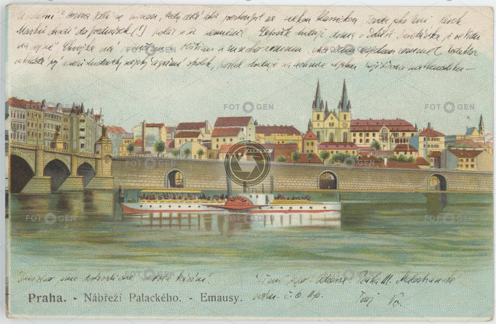 1907 bridge celkový pohled colored drawing Emausy Emauzský klášter Emauzy embankment chrám church kolorovaná kostel loď malba místopis most most Palackého nábřeží P. Marie a slovanských patronů painting panorama parník Podskalí Prague Praha Rašínovo nábřeží ship steamboat steamer temple topography výletní loď