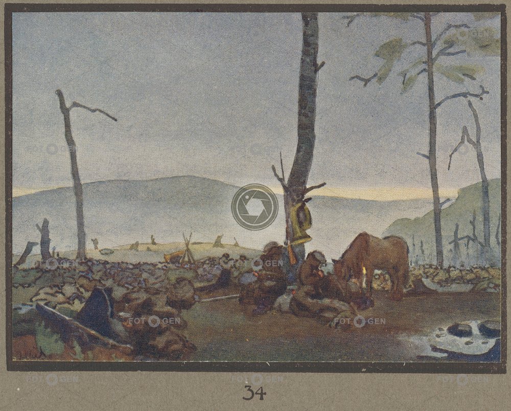 J. Vlček: Oddíl hudebníků a herců 1.pluku na přechodu přes Ural nocuje pod širým nebem / The detachment of musicians and actors of the 1st regiment spends the night in the open air while crossing the Urals
