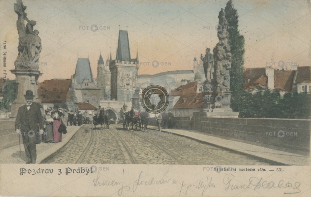 alive barevná bridge colored horse horse-drawn carriage Charles Bridge Karel Bellmann Karlův most koňka kůň Malostranská mostecká věž místopis most Prague Praha socha statue topography tower věž živá