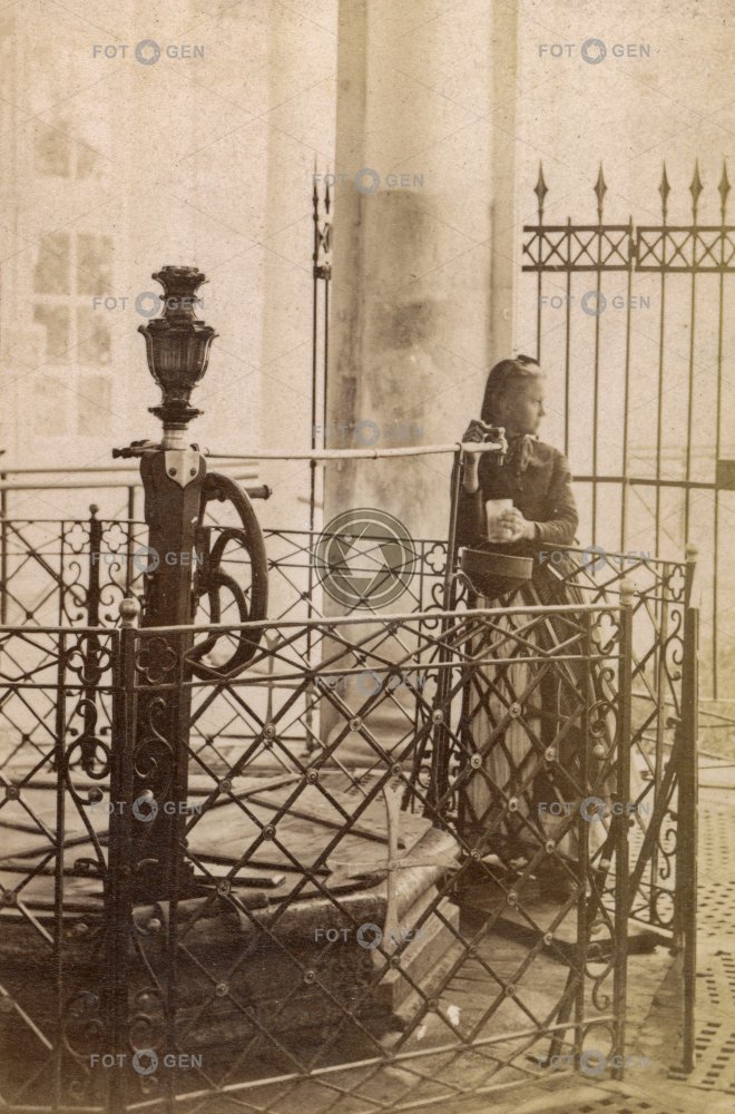 colonnade cross spring cup dívka girl jímání minerálky kalíšek kolonáda Kreuzbrunn Křížový pramen lázně Mariánské Lázně Marienbad mineral water mineral water collection minerálka místopis sací pumpa spa suction pump Tober's pump Toberovo čerpadlo topography