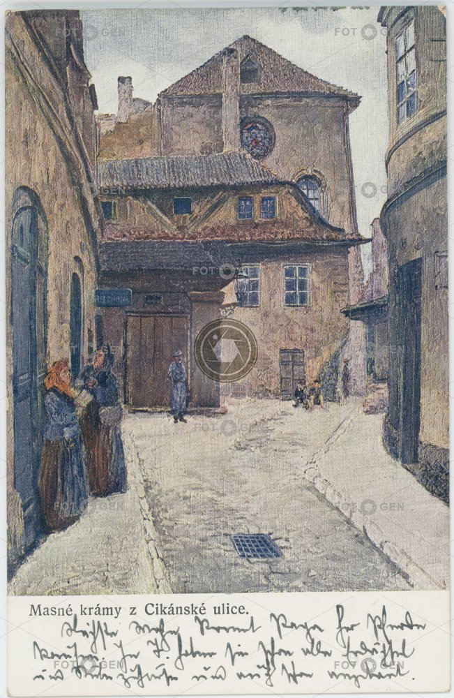 art asanace barevná Cikánská F.J. Jedlička Jan Bedřich Minařík Jewish ghetto Josefov Judaism malíř Masné krámy meat shop místopis neexistující budova nonexistent building Old Town painter Prague Praha redevelopment stará Praha Staré Město The Clearance of Josefov The Jewish Town topography umění Zmizelé pražské ghetto židovské ghetto židovské město