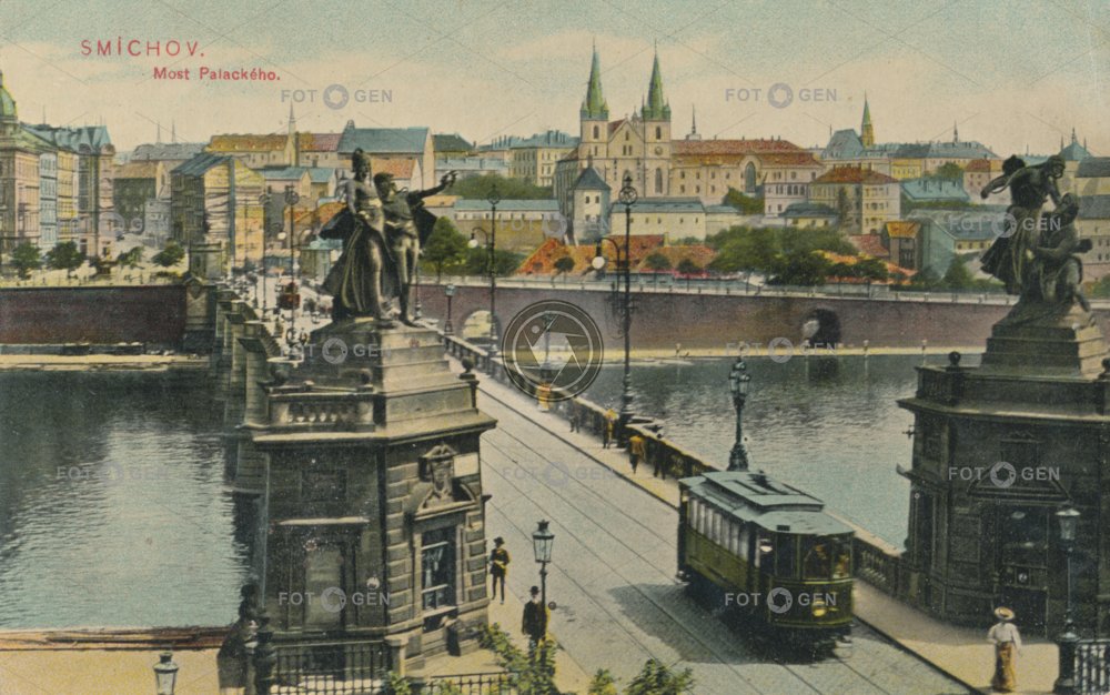 barevná benediktinů bridge colored Emauzský Emauzy chrám church klášter kolorovaná místopis monastery most Myslbek old Palackého panny Marie Podskalí Prague Praha pylon river řeka socha sochy statue topography tram tramvaj Vltava Vyšehrad Vyšehradské