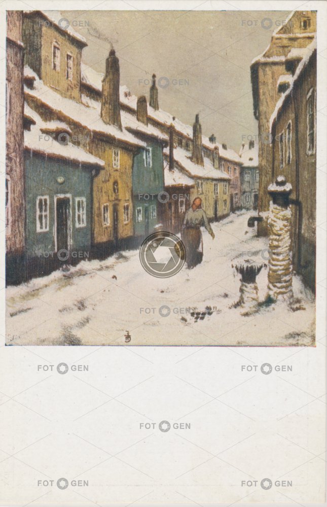 art barevná colored Golden Street Hradčany kolorovaná kresba malba místopis Prague Praha sněží sníh snow T.F.Šimon topography umění winter zima Zlatá ulička