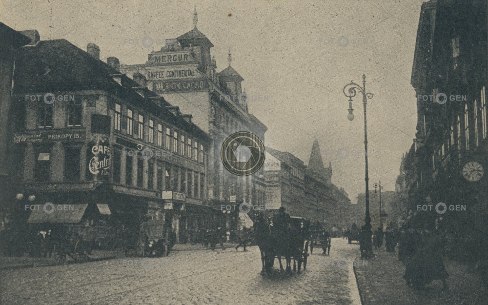 Bazar Parisien cafe cafe Central Central Continental hodiny kavárna lamp lampa Mercur místopis Na Příkopě Old and the New Town boundary pojišťovna pouliční hodiny pouliční lampa pouliční osvětlení Prague Praha Příkopy rozhraní Starého a Nového měst rozhraní Starého a Nového měst street clock street lamp street lamps topography U modrého raka