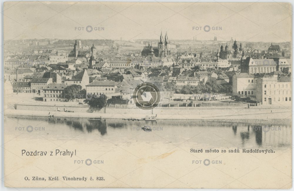 břeh řeky celkový pohled Dvořákovo nábřeží embankment Kostel Matky Boží před Týnem místopis neexistující neexistující stavba nonexistent building Old Town panorama panoramatická panoramic Prague Praha river řeka Staré Město topography tower towers Týnský chrám věže Vltava