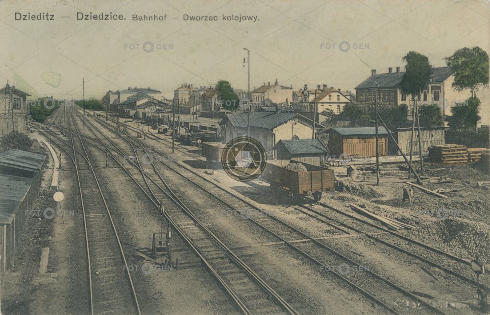 1914 barevná colored doprava dráha Dziedzice koleje kolorovaná místopis Polish Polska Polsko railway station switch topography track transport trať turnout vagon vagony výhybka železniční