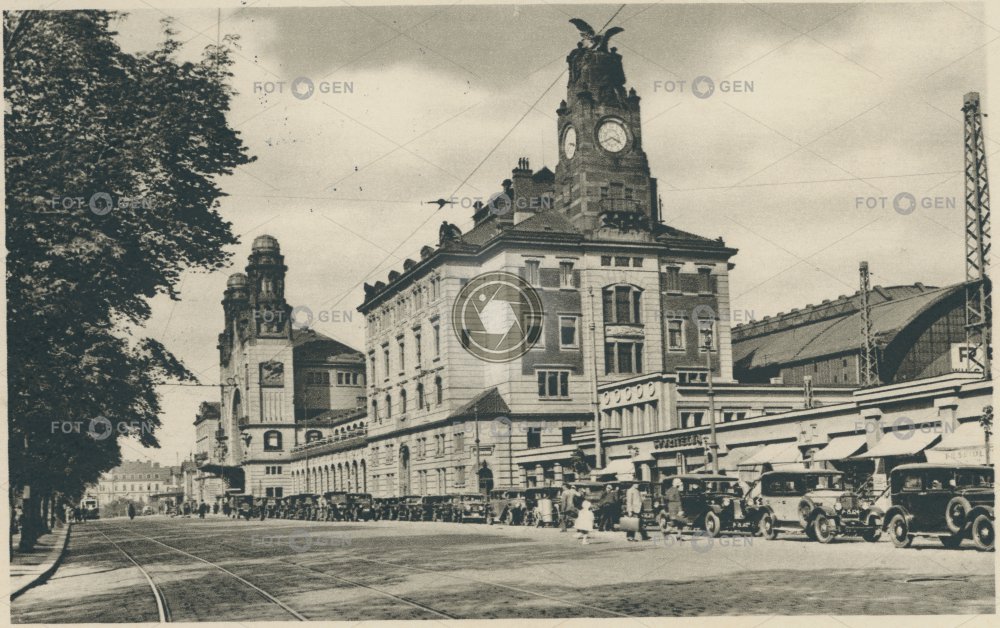 auto autobus budova car clock Fantova FJI Františka Josefa I. Franze Josefa Hlavní nádraží hodiny Hooverova místopis nádraží Prague Praha railway station railway station building station taxi topography třída Wilsonova Wilsonovo nádraží