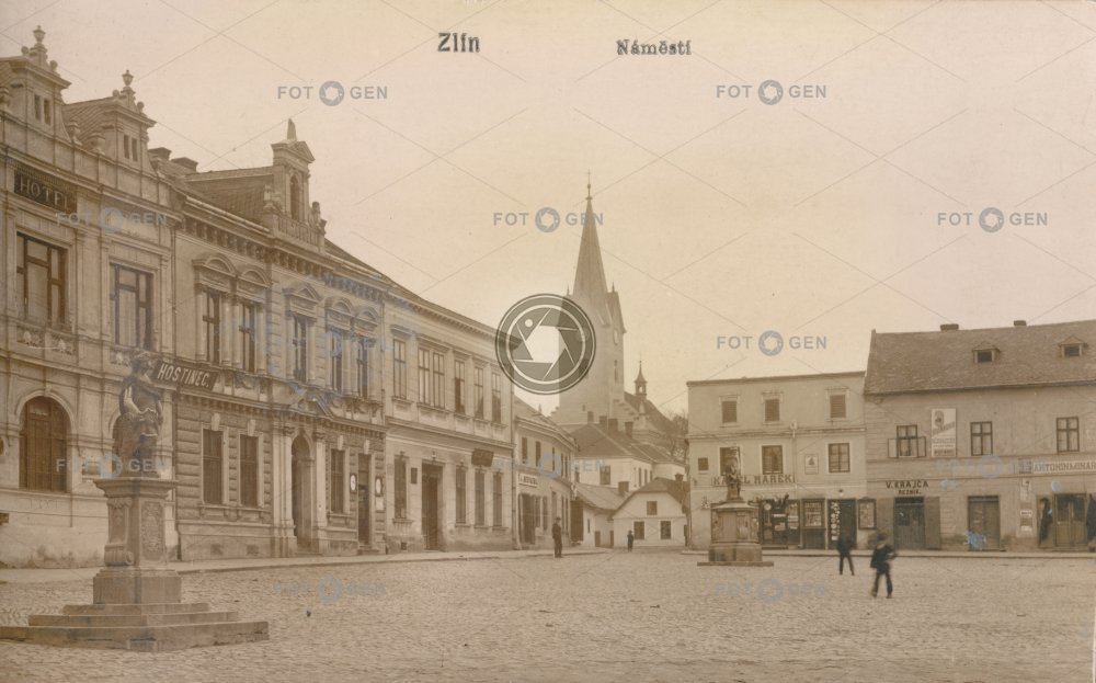 budova C. k. demolice Geschäft hotel church Karel Marek Kirche kościół kostel kostel sv. Filipa a Jakuba místopis náměstí náměstí Míru neexistující obchod sculpture shop sklep socha square statue stavba The Imperial Royal topography üzlet záložna Zlín Zlínský kraj