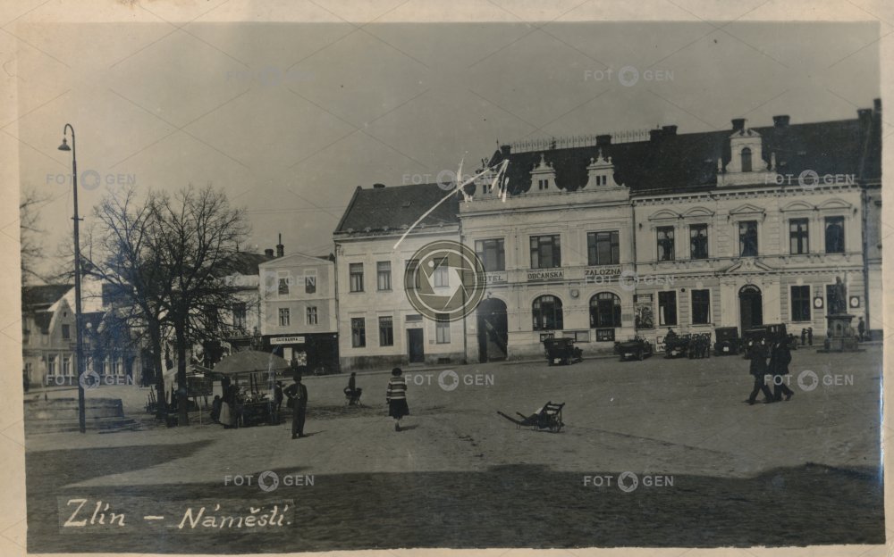 auto car Credit union fontána fountain hotel kašna místopis náměstí Míru pouliční osvětlení topography trh trhovec záložna Zlaté jablko Zlín Zlínský kraj