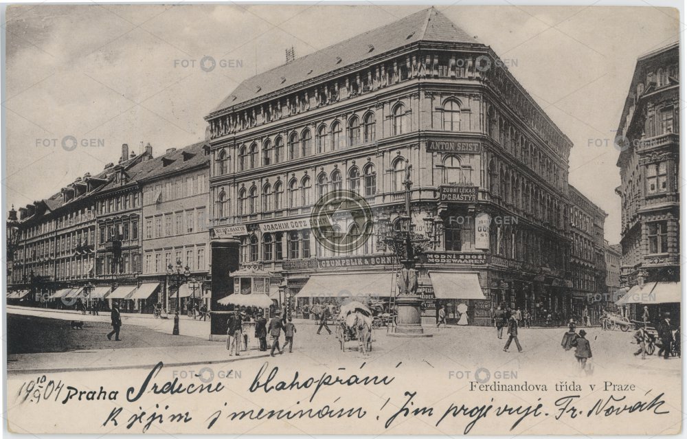 1904 Ferdinandova gas handcart horse Hypotéční banka Jungmannovo náměstí kandelábr koňský povoz kůň lamppost lighting místopis náměstí Národní Neo-Renaissance New Town Nové Město novorenesance obchody Old Town osvětlení Perlová plynový pouliční lampa Prague Praha reklamní sloup rozhraní ruční vozík shop square Staré Město topography
