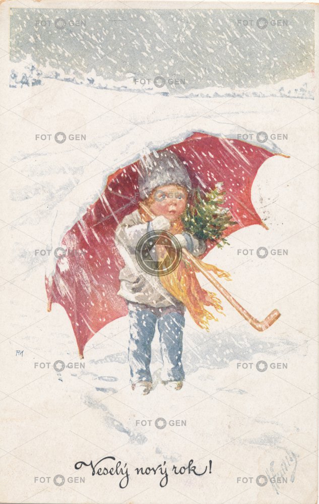 Boy deštník děti dítě Feiertage holidays child chlapec Christmas Christmas tree junge Kind krajina kreslené leisure malované novoroční nový rok prvorepublikové přání Regenschirm scenery / landscape sněžení sníh stromeček sváteční svátky umbrella vánoce vánoční volný čas Weihnachten Weihnachtsbaum zasněžená zima