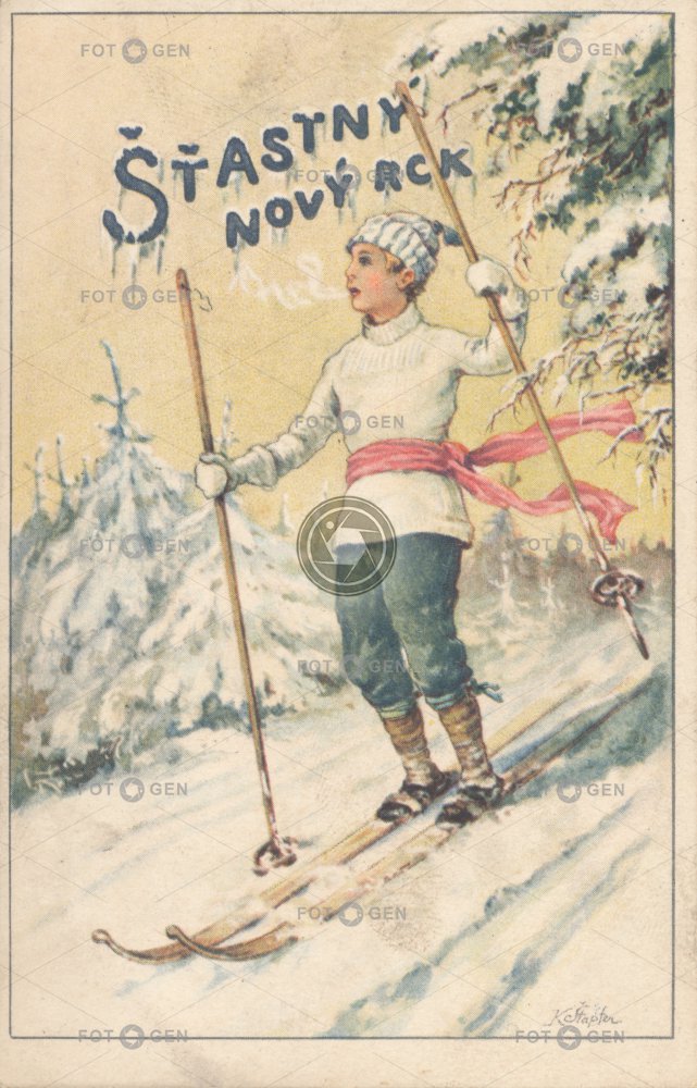 Feiertage holidays Christmas kreslené leisure lyžař lyže lyžování malované novoroční nový rok prvorepublikové přání Skifahren skiing sváteční svátky vánoce vánoční volný čas Weihnachten