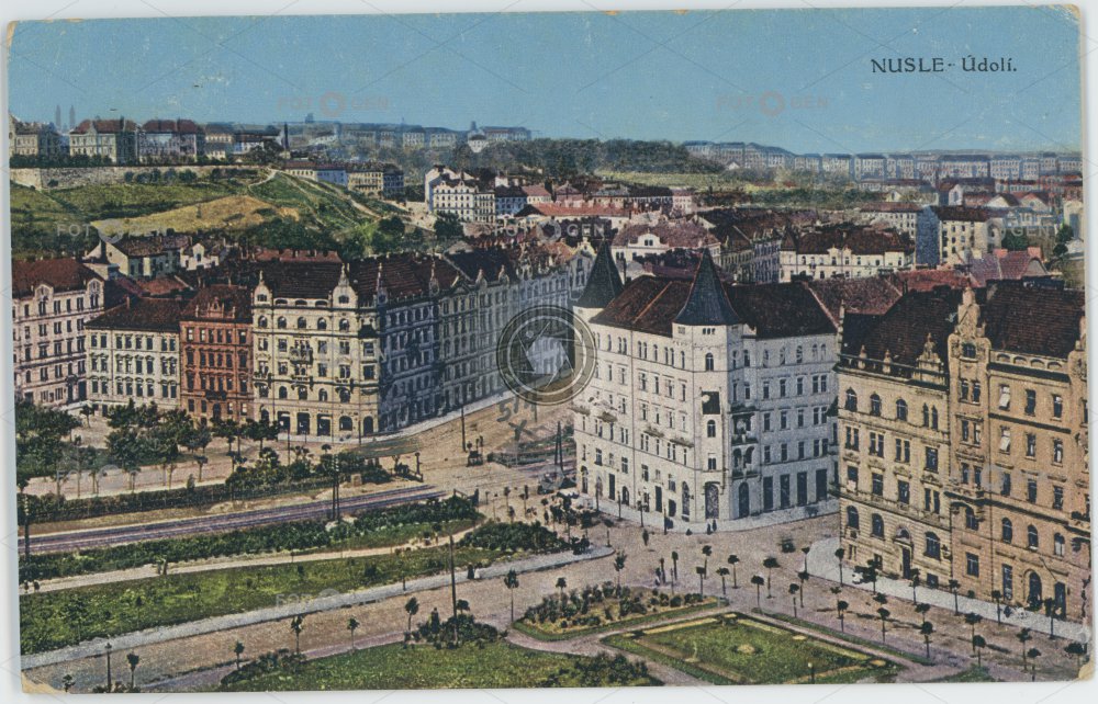 barevná celkový pohled colored hotel Union Jaromírova kolorovaná místopis Nusle Ostrčilovo panorama Prague Praha Praha 4 Přemyslovo railway track square street topography trať