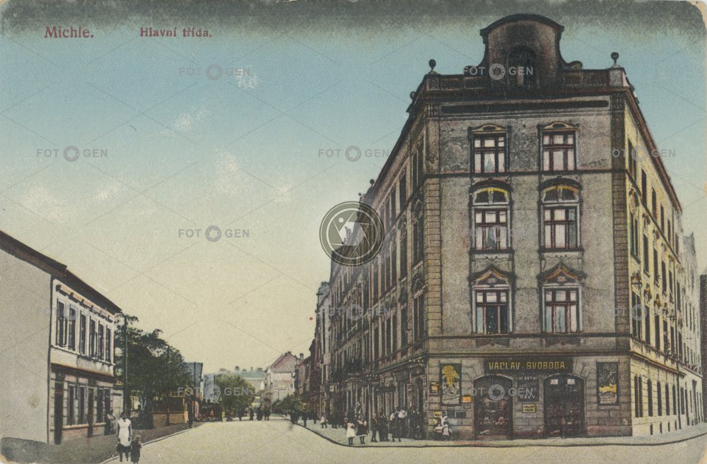 1910 barevná color colored Hlavní třída Jezerka kolorovaná Michle místopis Nuselská ulice obchod Prague Praha shop topography Václav Svoboda