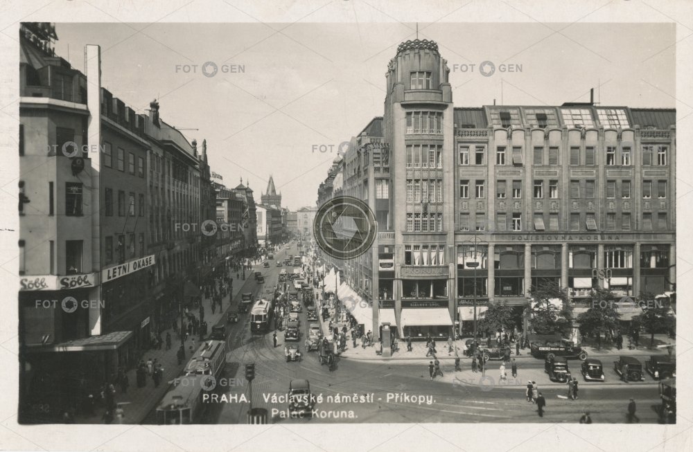 1940 auto automobil Golden Cross koruna kříž místopis Na Příkopě náměstí New Town Nové Město palác pojišťovna pouliční pouliční ruch Prague Praha Příkopy ruch square street traffic topography tram tramvaj tramvaj 5 Václavák Václavské Wenceslas Wenceslas Square Zlatý Zlatý kříž