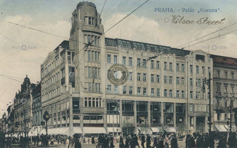 alive barevná colored department store Golden Cross koruna místopis Na Příkopě Neo-Renaissance novorenesance obchodní dům palác Koruna palace pouliční hodiny Prague Praha Příkopy store street clock topography U Špinků Václavák Václavské náměstí Wenceslas Square Zlatý kříž živá