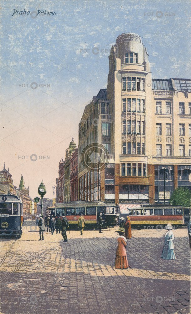 bank colored Golden Cross kolorovaná koruna kříž místopis Na Příkopě Na Příkopech náměstí New Town Nové Město palác Pfeiffer pojišťovna Prague Praha Příkopy square topography tram tramvaj Václavák Václavské Wenceslas Wenceslas Square Zlatý Zlatý kříž