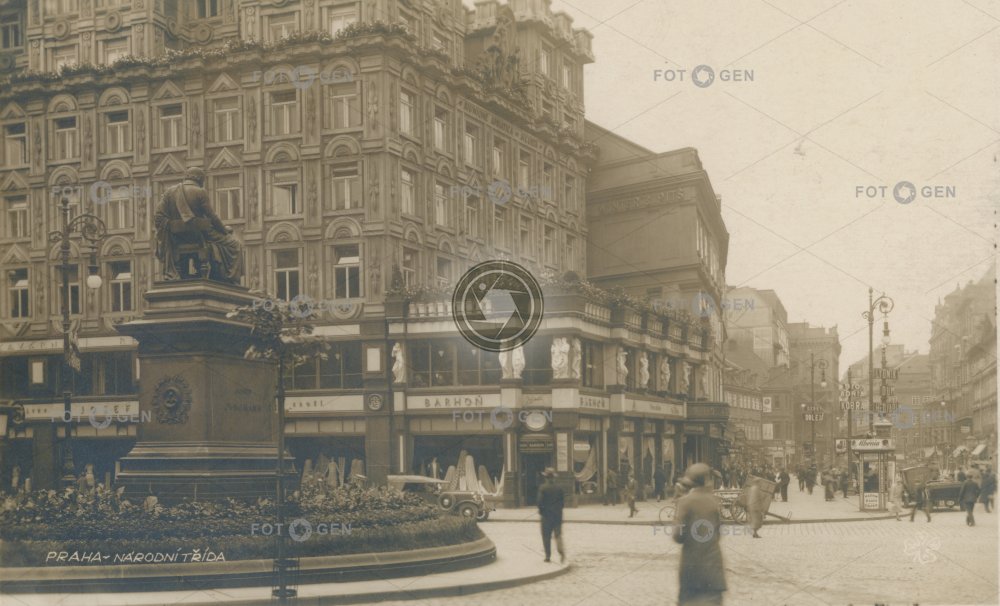 1925 Adria alive Barhoň insurance company Josef Jungmann Jungmannova Jungmannovo Laterna magika memorial místopis monument Národní palác palace pojišťovna pomník pouliční lampa Prague Praha Réunione Rondocubism Rondokubismus sculpture socha street lamp topography živá
