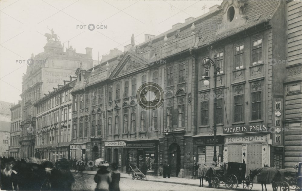 1912 alive autodíly automotive bank banka barrow cab drožka dvoukolák ekvipáž equipage fiacres fiakr horse-drawn carriage klasicismus koňský povoz lighting Michelin místopis Na Příkopě Na Příkopech Neoclassical osvětlení palác palác Příchovských pouliční lampa Prague Praha prodejna autodílů Příchovských street lamp topography Trade licenses Bank živá živnostenská