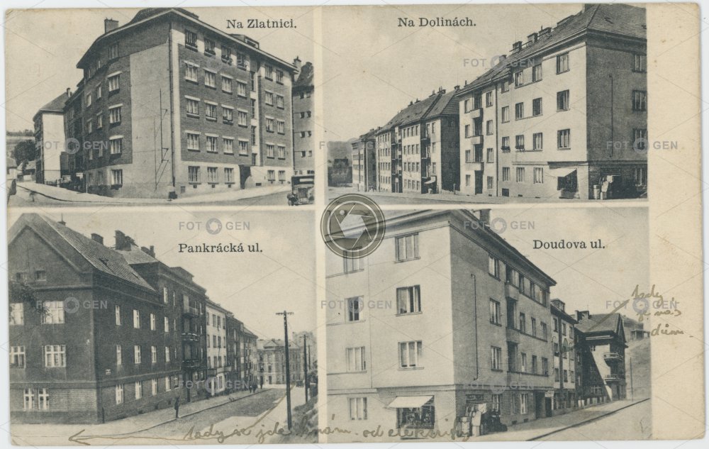 Praha-Podolí, Na Zlatnici, Na Dolinách, Pankrácká a Doudova ulice, cca 1938. Prague-Podolí, Na Zlatnici, Na Dolinách, Pankrácká and Doudova streets, circa 1938.