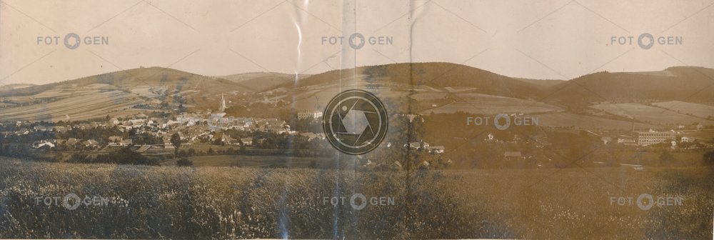 Panoramatická pohlednice Zlína ještě před rozmachem. Vpravo patrná první budova Baťových závodů.
