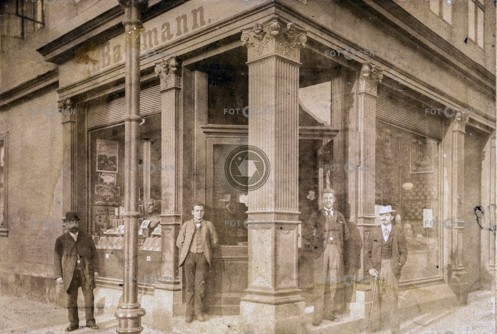Pánská společnost před nezjištěným obchodem K. Baumanna, kolem 1895, kabinetka Autor: Neznámý