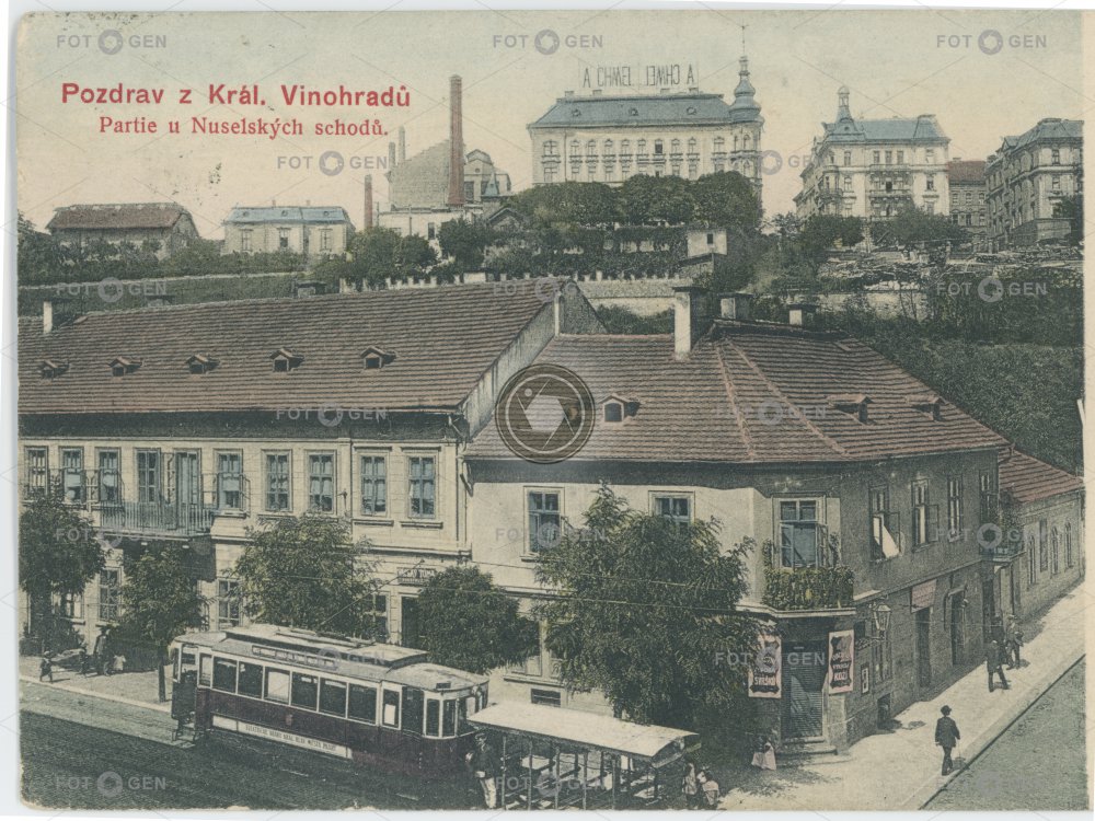 1899 Antonín Chmel barevná colored factory místopis Nuselské schody Nusle otevřený vagon Prague Praha topography továrna továrna na šunky a uzaninu tram tramvaj Vinohrady
