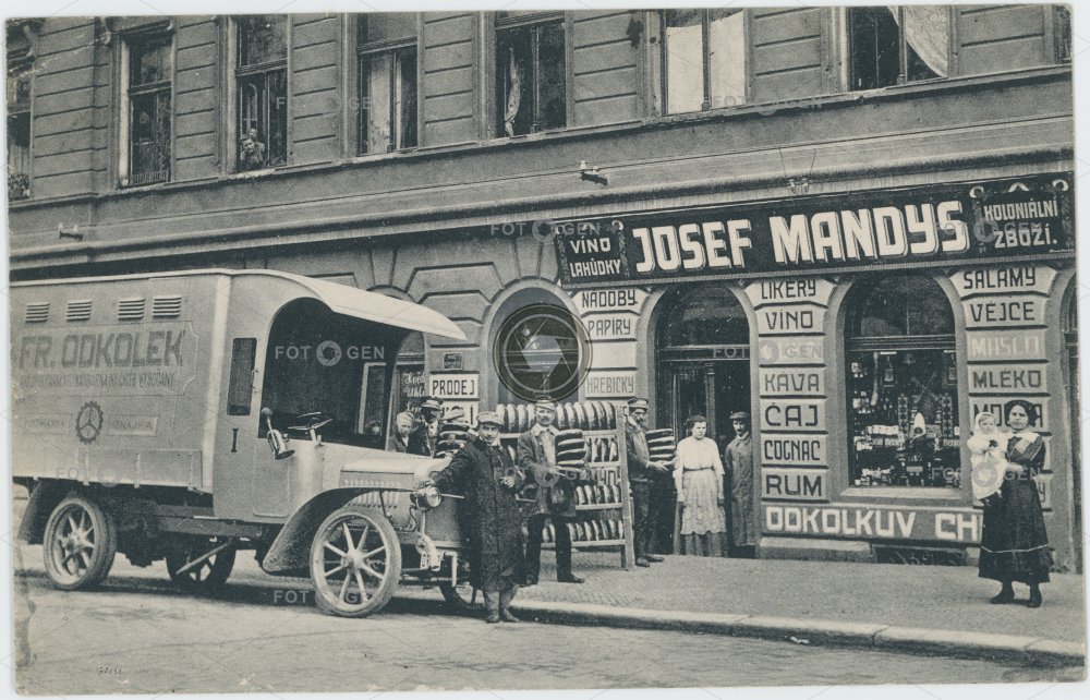 1915 alive auto bakery bread car Fr. Odkolek goods chleba Košíře lidé Mandys Menschen místopis náklaďák nákladní auto obchod Odkolek pastry pečivo pekařství people Prague Praha shop smíšené zboží store topography truck zboží živá