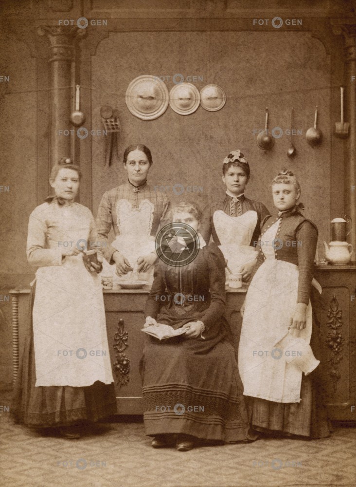black and white catering cooking černobílý dishes džbán employees food group historically historický hmoždíř housemaid jídlo kitchen kuchařky kuchyň ladle mortar naběračka nádobí nutrition pitcher poklice portrait portrét práce profese profession retro sepia sépie skupina služebnictvo stravování stůl table vaření výživa work zaměstnanci